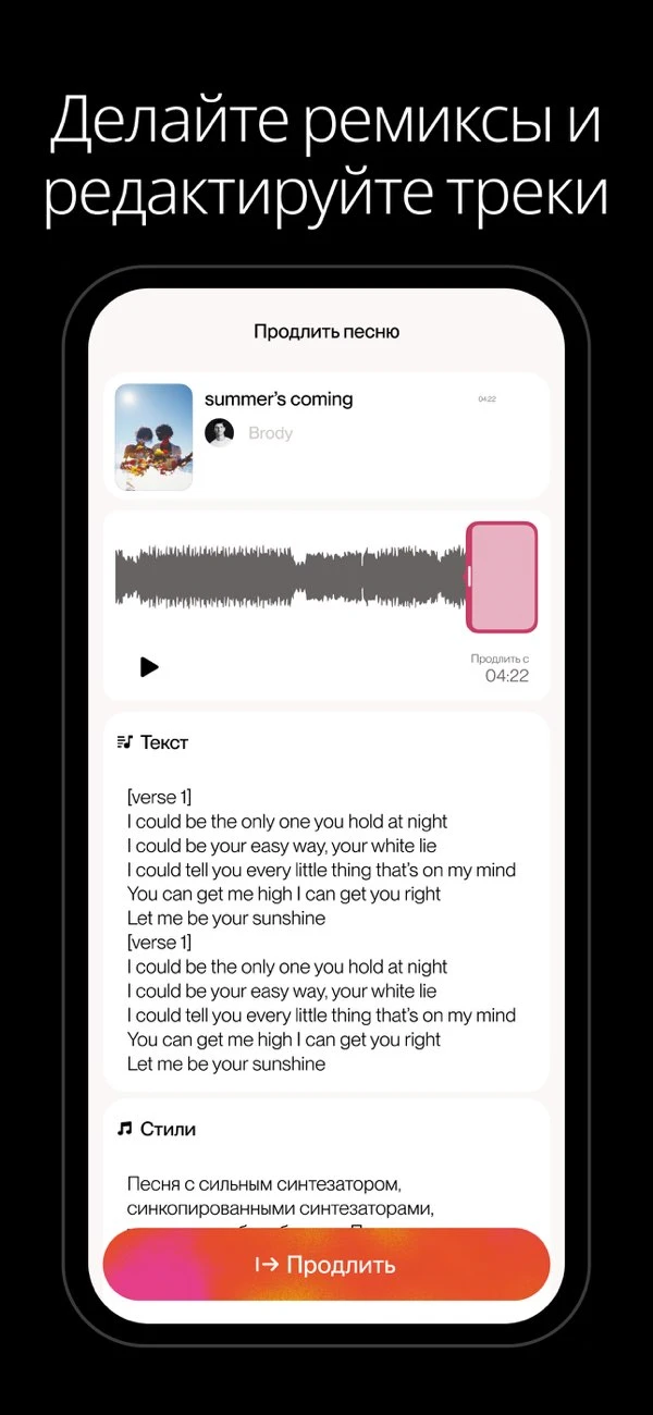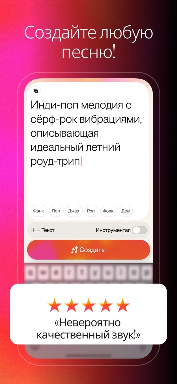 - ✍️ Персонализированный текст — улучшайте свою песню с помощью предложенного ИИ текста или редактируйте его под свои нужды.