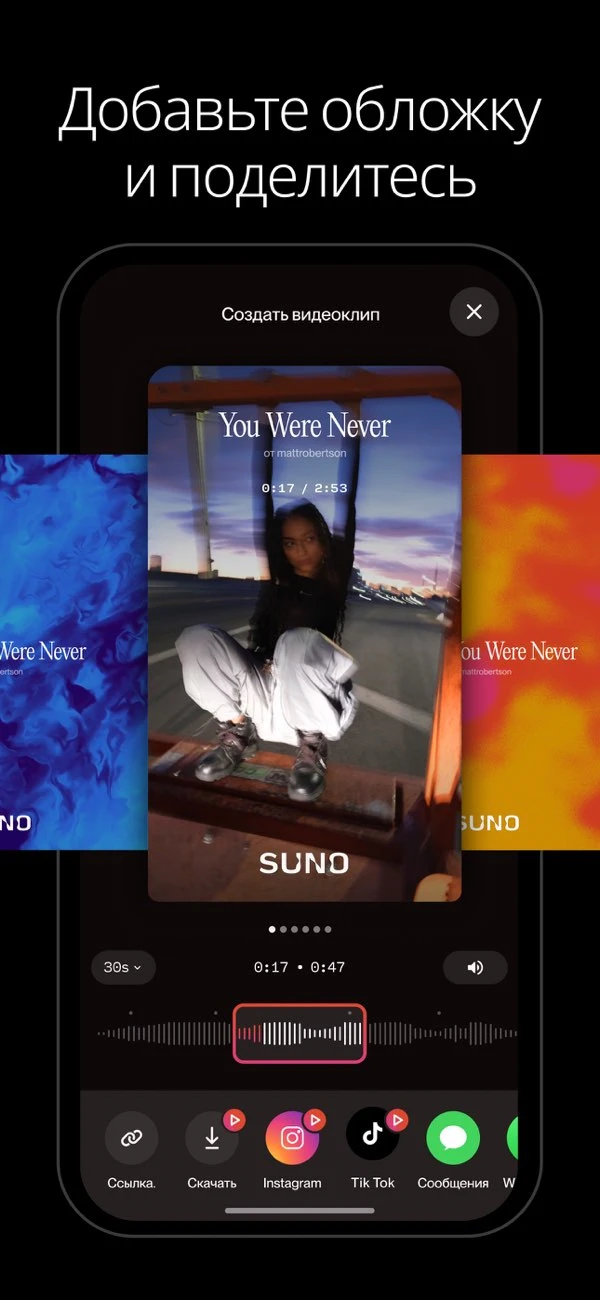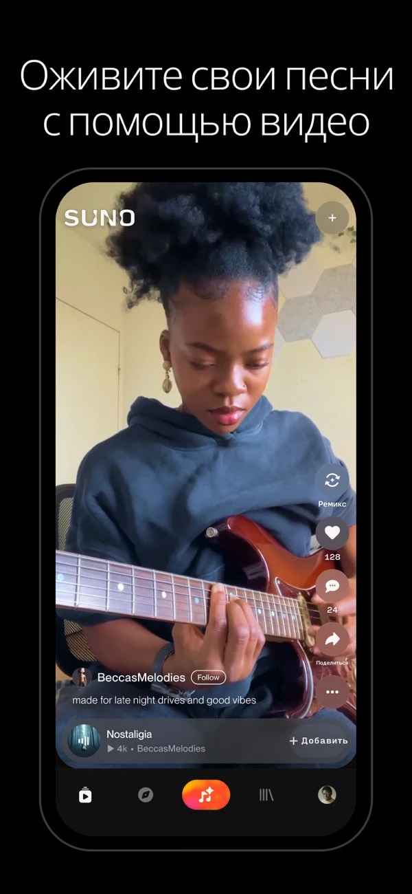 Создавайте и открывайте для себя музыку с Suno — музыкальной студией на основе искусственного интеллекта, которая помещается прямо в вашем смартфоне. Suno поможет вам воплотить в жизнь любую, даже самую невероятную музыкальную идею, независимо от вашего уровня подготовки. Будь вы певец-любитель или прославленный хитмейкер — здесь вы найдёте инструменты для творчества, которые раньше были доступны только профессионалам.